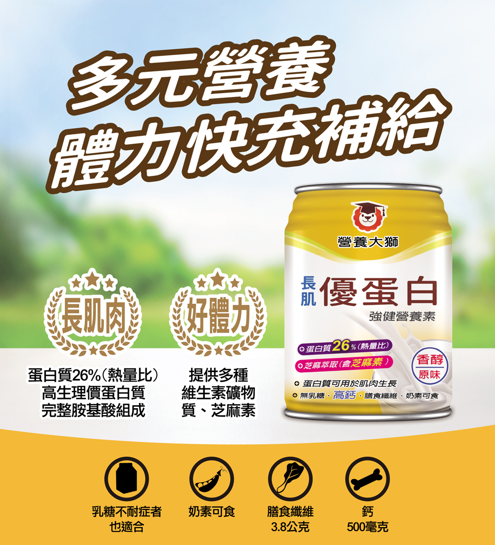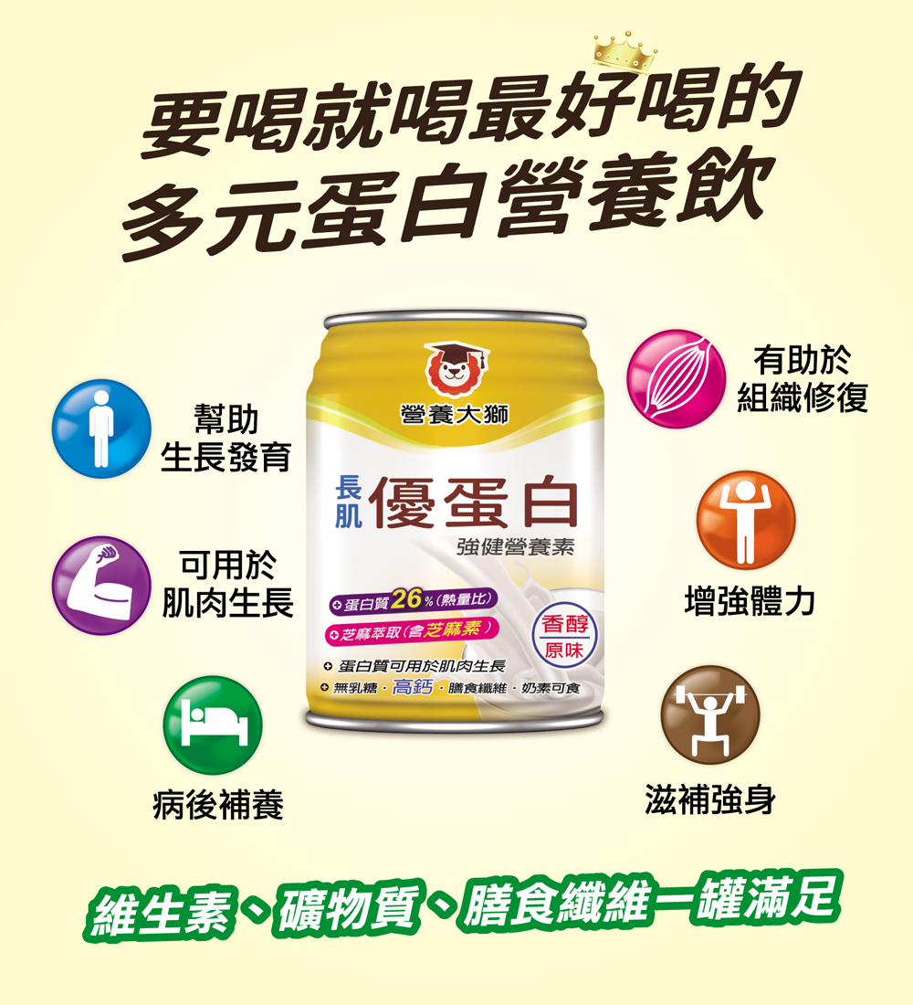 1.高生理價蛋白質26%(熱量比):可用於肌肉生長,有助於組織修復。