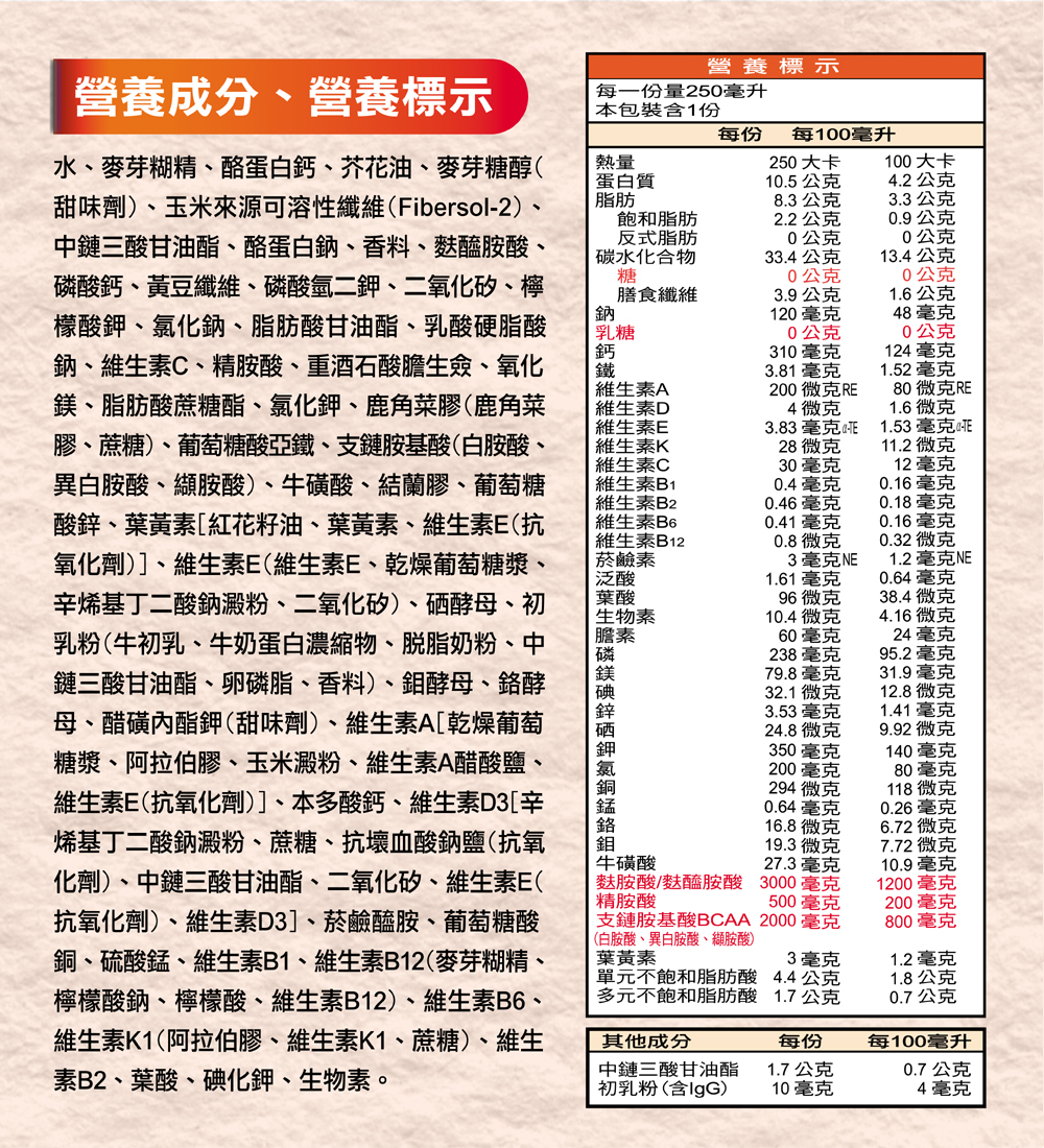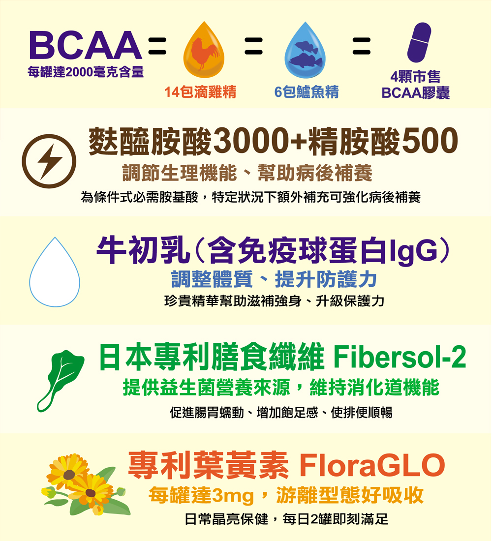 1.30多種營養素,補充日常維生素、礦物質需求,滋補強身。 2.BCAA增強體力,優質蛋白質可用於肌肉生長、幫助組織修復。 3.專利葉黃素守護晶亮元素,給您亮采新視野。 4.初乳粉含IgG免疫球蛋白,調整體質、防護升級。